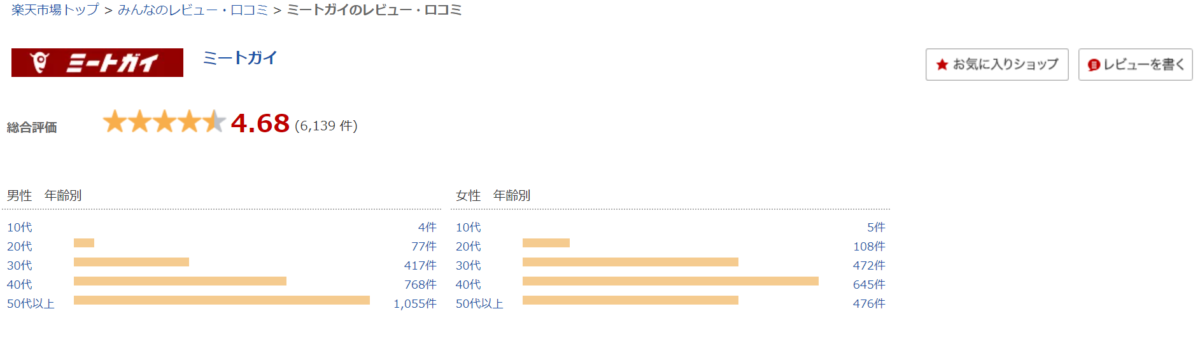 楽天市場では出品者であるショップの評価が確認できますが、ミートガイは評価件数6000件越え、星4.68という高評価を叩き出しています。